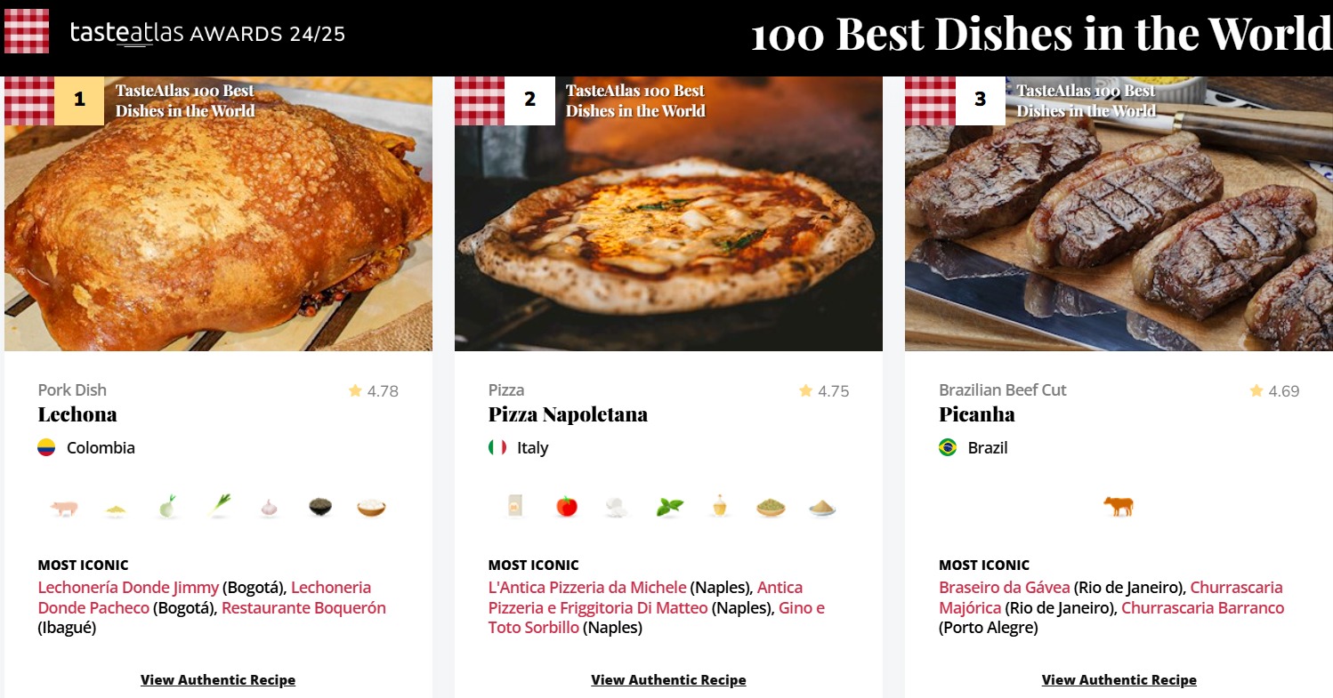TasteAtlas(https://www.tasteatlas.com/)는 전 세계의 전통 요리와 지역 음식을 소개하는 온라인 가이드로, 매년 사용자 평가를 기반으로 최고의 요리를 선정합니다. 2024년 기준, 약 36만 7,847개의 유효한 평가를 통해 11,258개의 요리를 분석하여 '세계 최고의 요리 100선'을 발표했습니다.