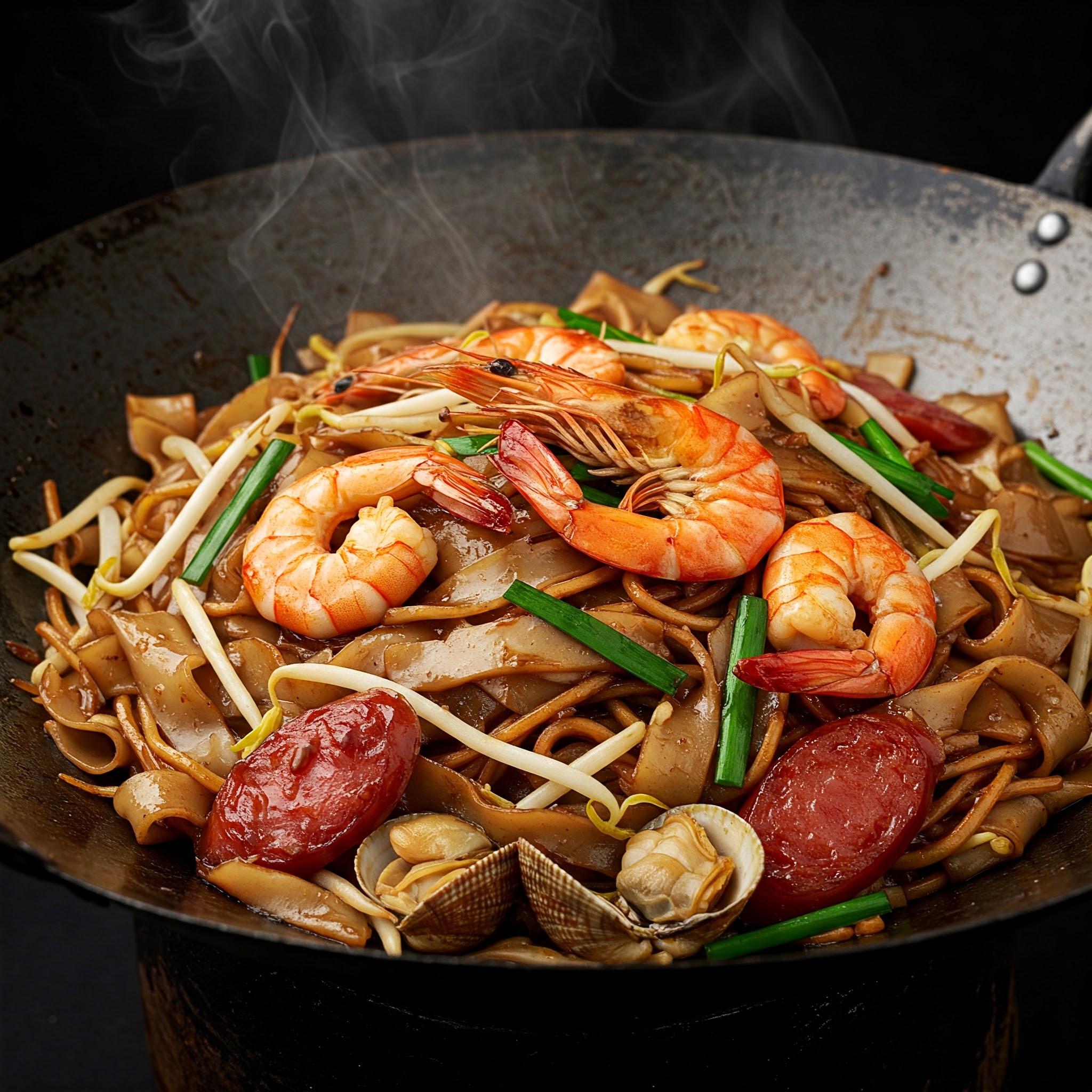 차 퀘이 티아오는 넓적한 쌀국수를 새우, 계란, 숙주, 중국 소시지 등과 함께 강한 불에 볶아 만든 요리입니다. 기름지면서도 불맛이 살아 있어 중독성 강한 맛을 자랑합니다.