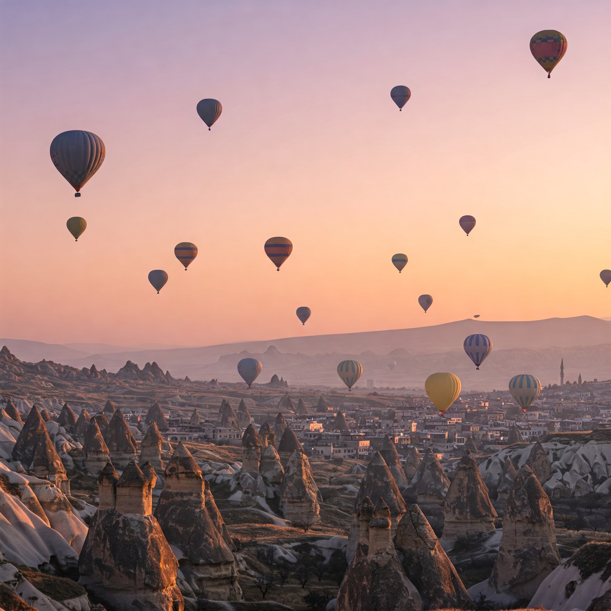 카파도키아 여행의 하이라이트! 이른 아침 하늘을 수놓는 수백 개의 열기구를 타고 환상적인 풍경을 감상해 보세요. 일출과 함께하는 열기구 투어는 인생 최고의 순간이 될 거예요!