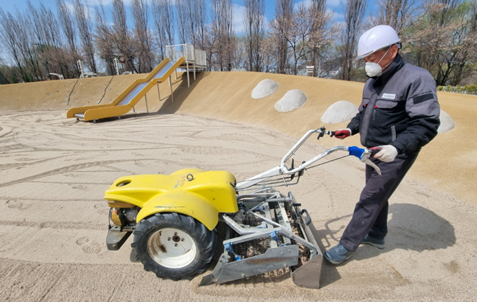 바로, 한강공원 내 어린이 놀이터, 씨름장, 백사장 등 모래놀이공간 14개소(어린이놀이시설 11개소, 야외체육시설 3개소)를 대상으로 고온 스팀 소독을 시행했어요!